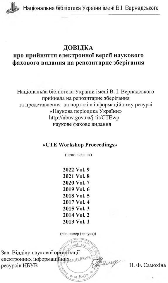 Since September 2022, all volumes of CTE Workshop Proceedings are preserved by the Vernadsky National Library of Ukraine (see certificate of preservation).